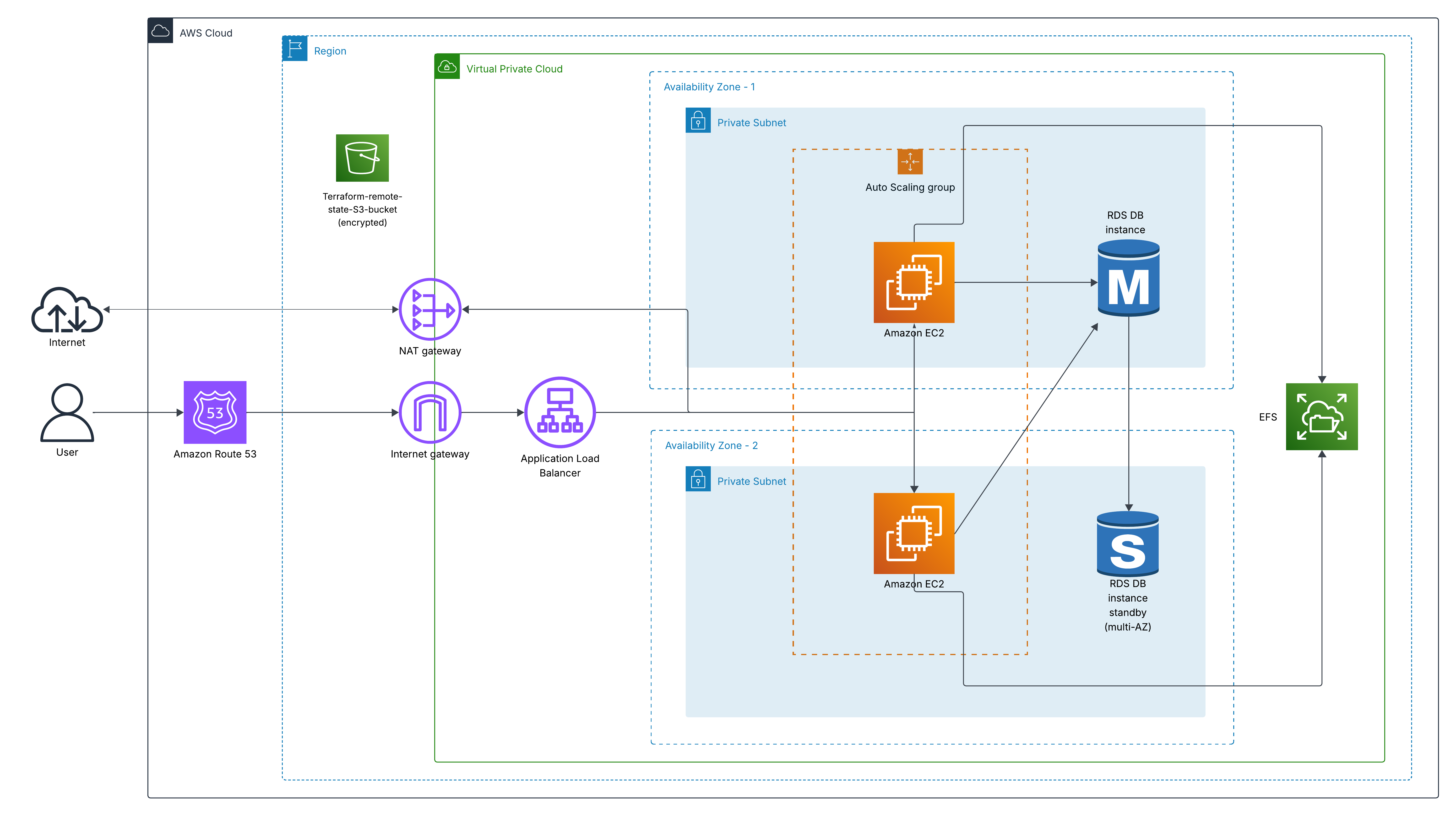 This project provisions fault‑tolerant web hosting on AWS with Auto Scaling, ALB, Multi‑AZ RDS & EC2, Route 53, and EFS—built for high availability and scalability.