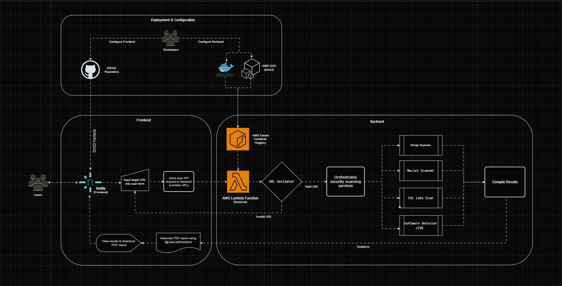 Built one‑click web app for automated security auditing, integrating Nmap, Nuclei, SSL Labs, and CVE lookups. providing real‑time results with PDF reports including security scores and remediation guidance.